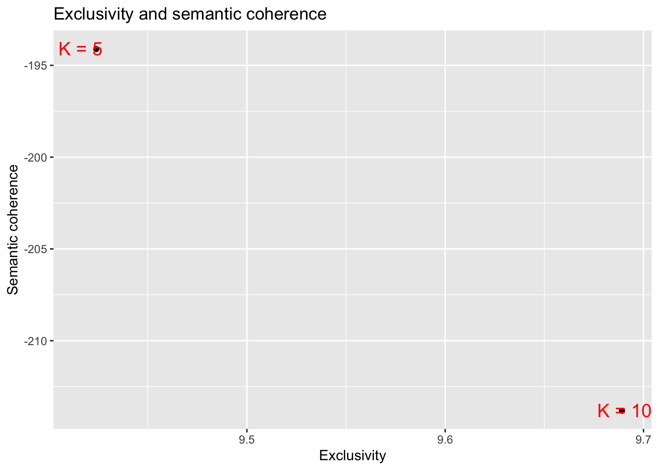 Several metrics assess topic models’ performance: the held-out likelihood, residuals, semantic coherence, and exclusivity. Here we examine the relationship between semantic coherence and exclusivity to understand the trade-off involved in selecting K.